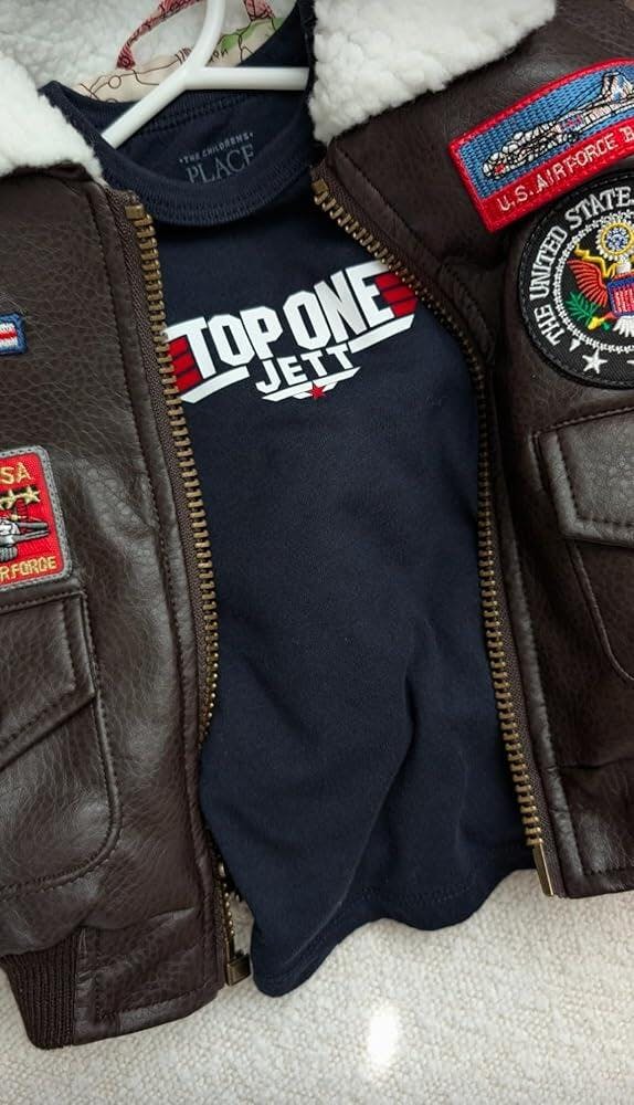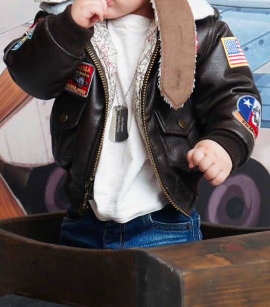 Description: Authentically designed A-2 Bomber Jacket. For the child who wants to be a pilot, this authentically detailed Up and Away A-2 Bomber Jacket looks like the real thing worn by W.W. II aviators. The jacket features nine colorful patches on the front, back and sleeves. Includes an airplane zipper pull, and four pockets including two that snap. There is a Sherpa collar, ribbed cuffs and waistband, snap epaulets, and a military map lining. The leather-like Up and Away A-2 Bomber jacket has plenty of attitude! Clean by wiping with a wet cloth and mild soap. Note: we normally recommend jackets one size larger than the age of the child.